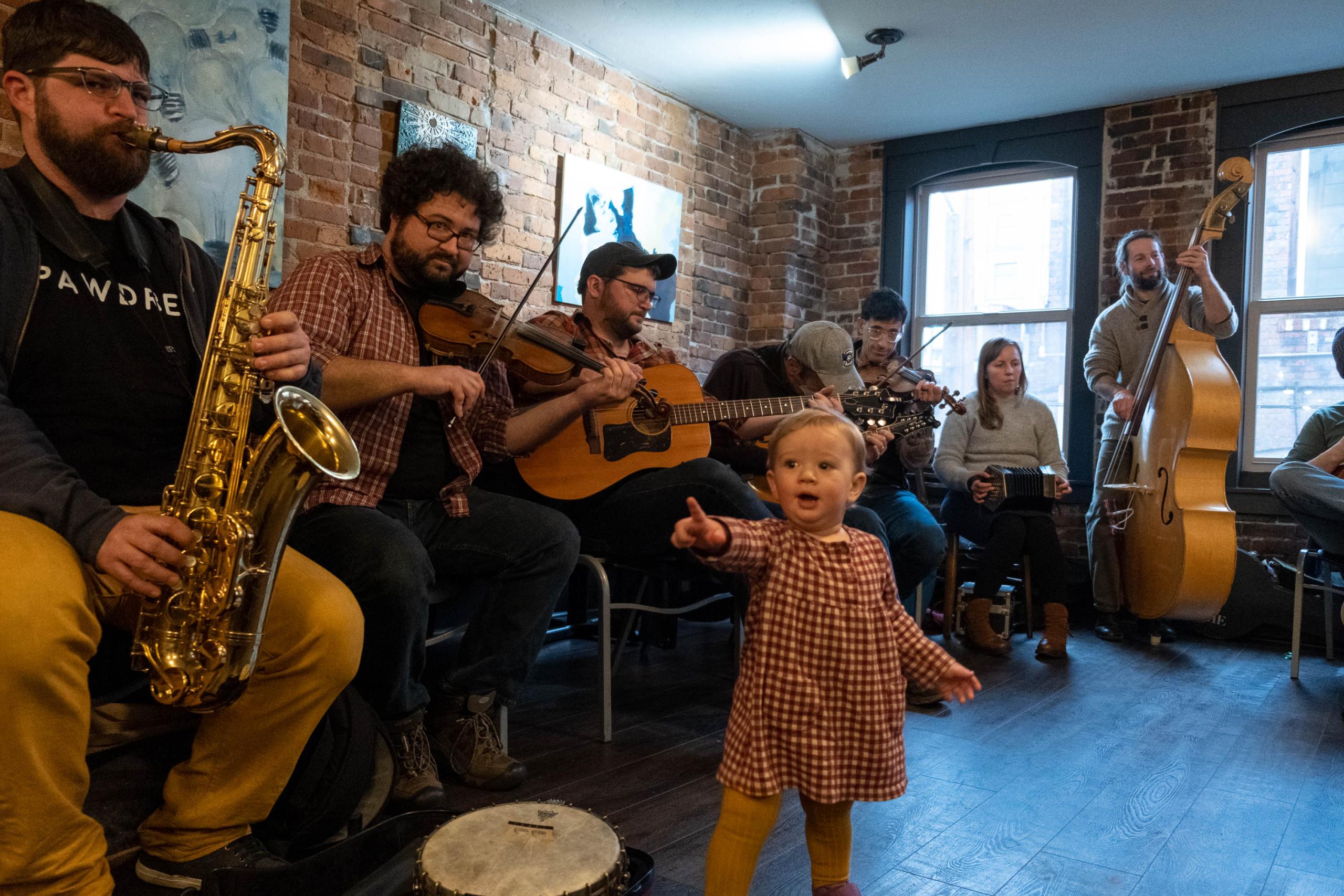 A collection of people play various instruments in a room with a brick wall. A toddler stands in the foreground.
