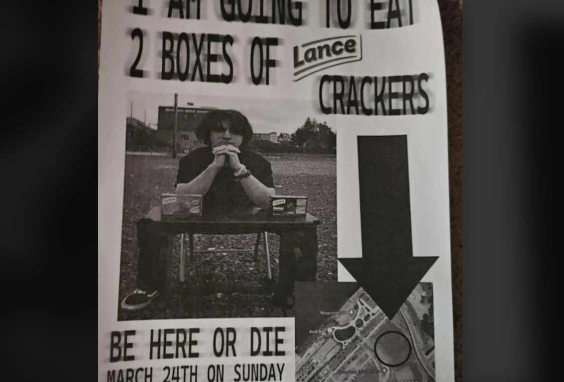 The Bellingham Herald reports that the student named Martin was “bored” when he decided to eat two boxes of Lance crackers without water in front of a crowd last Sunday at 3 p.m.