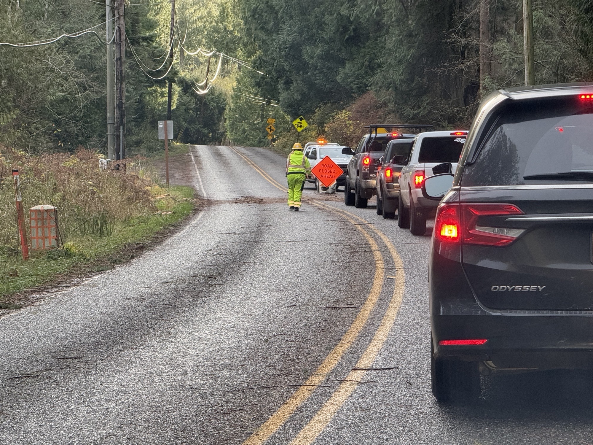 Both directions of SR 9 remain closed north of Sedro-Woolley due to several fallen trees and power lines.