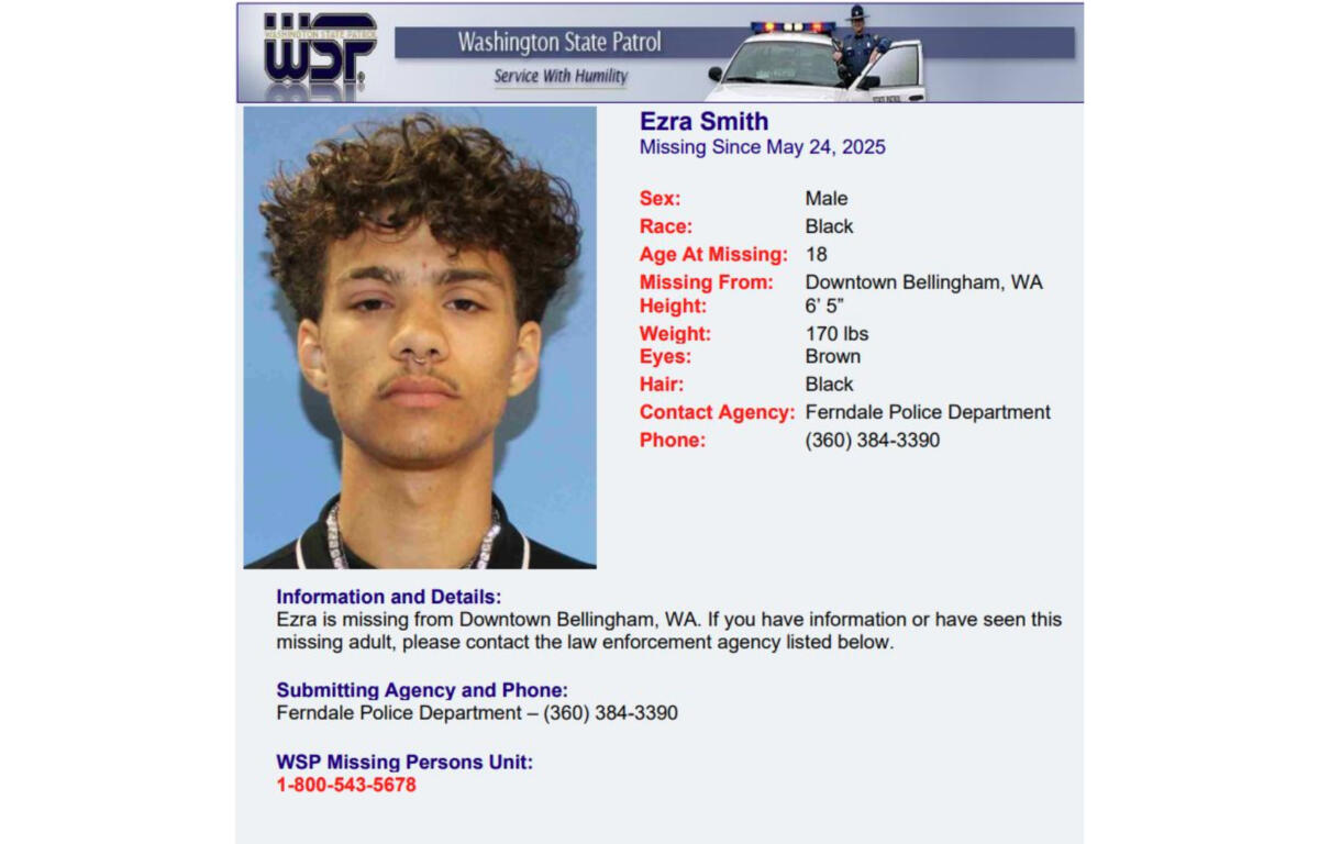 The department says 18-year-old Ezra Smith has been missing since May 24.