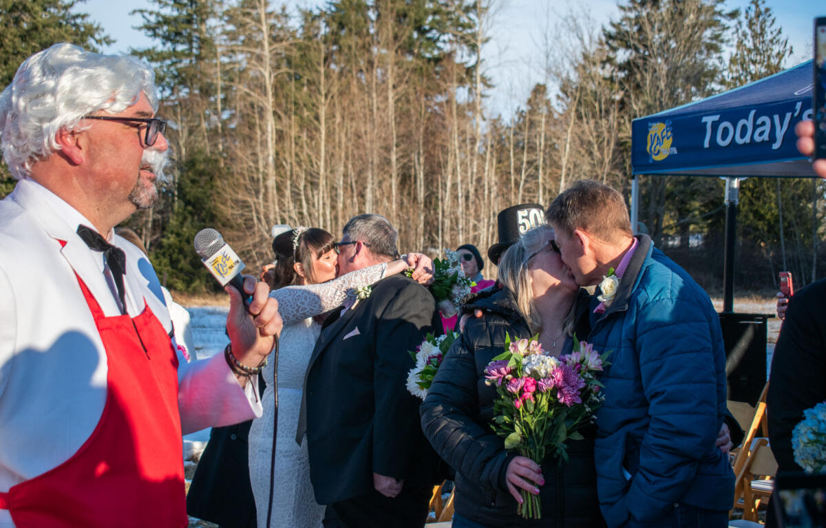 BELLINGHAM, WA (MyBellinghamNow.com) – Love and the smell of Kentucky Fried Chicken was in the air as KAFE 104.1 hosted a group wedding at the top of Yew Street hill in Bellingham.
