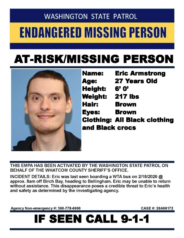 Washington State Patrol says that 27-year-old Eric Armstrong was last seen getting on a WTA bus from Birch Bay to Bellingham on the morning of Wednesday, Feb. 18. He is described as a 6-foot-tall white man, last seen wearing all black clothing, including black Crocs.