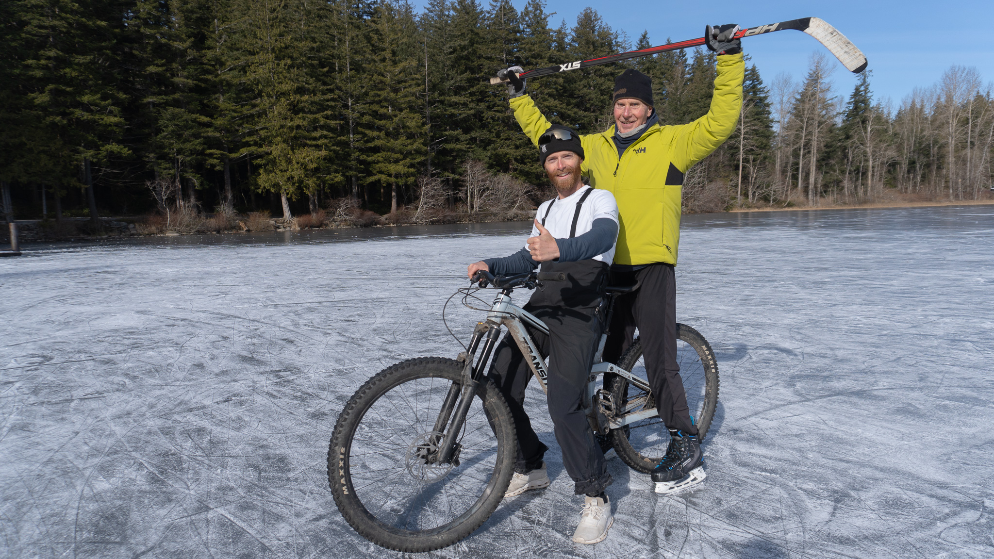 Arnold and Yattagooch enjoy time on the ice with a Transition mountain bike. Photo by Sam Kristofferson