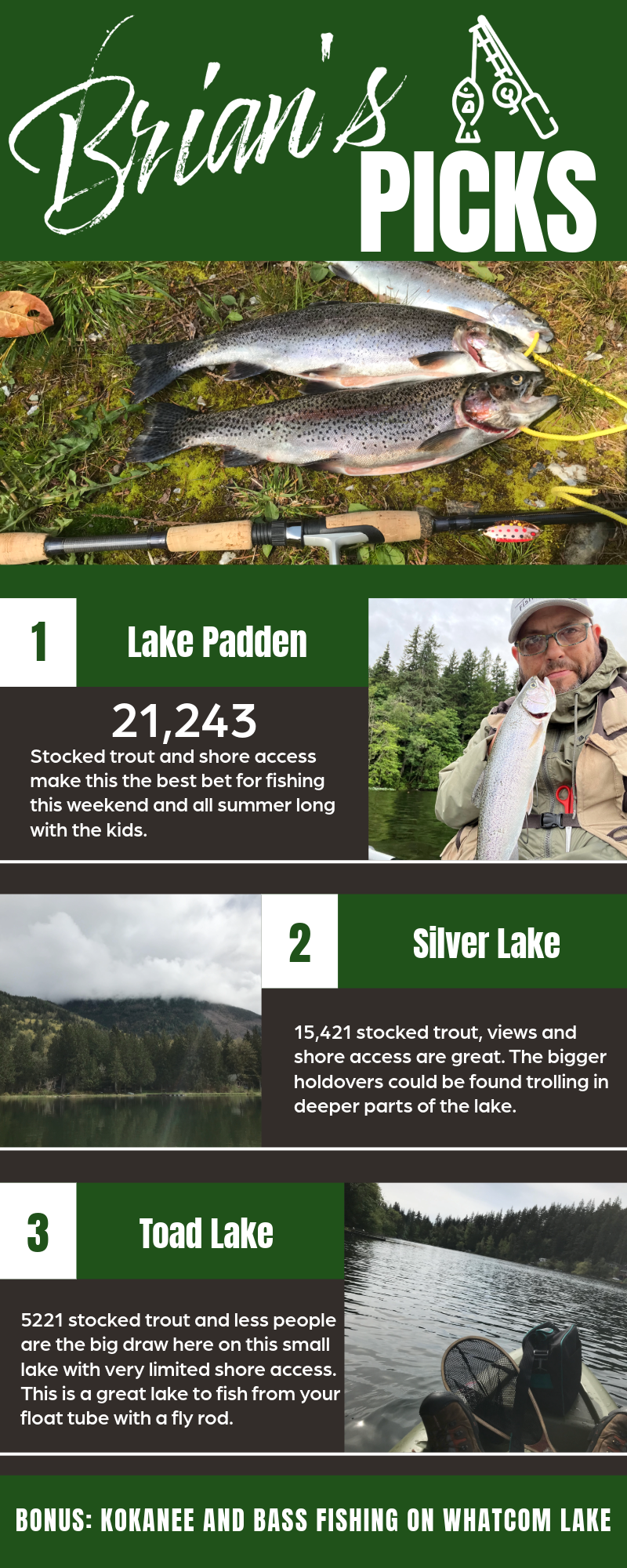 In Skagit County, there are three lakes for anglers hoping to catch more than dinner with Lake Erie, Lake McMurray and Sixteen Lakes all stocked with derby trout.